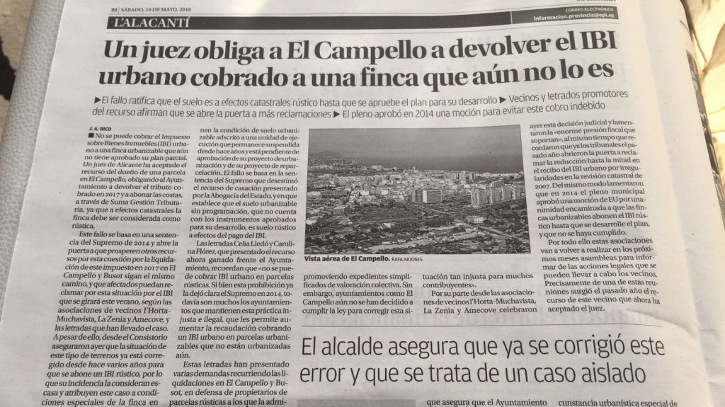 Sin embargo, pese a que la sentencia obligó a modificar el art. 7 de la ley de Catastro en 2015 y que establecía que no se pueden grabar como urbanos los terrenos que no tengan aprobado ordenación detallada o pormenorizada que les permita, conforme la legislación aplicable, construir de forma inmediata, aún existen Ayuntamientos como el de El Campello en Alicante que siguen cobrando el impuesto aunque los terrenos estén sin urbanizar.